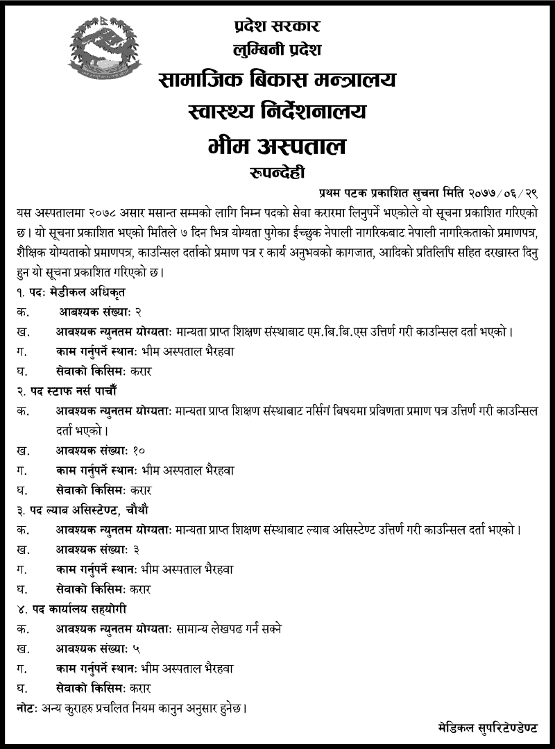 Province Government, Lumbini Pradesh, Ministry of Social Development, Directorate of Health, Bhim Hospital, Rupandehi, Bhairahawa