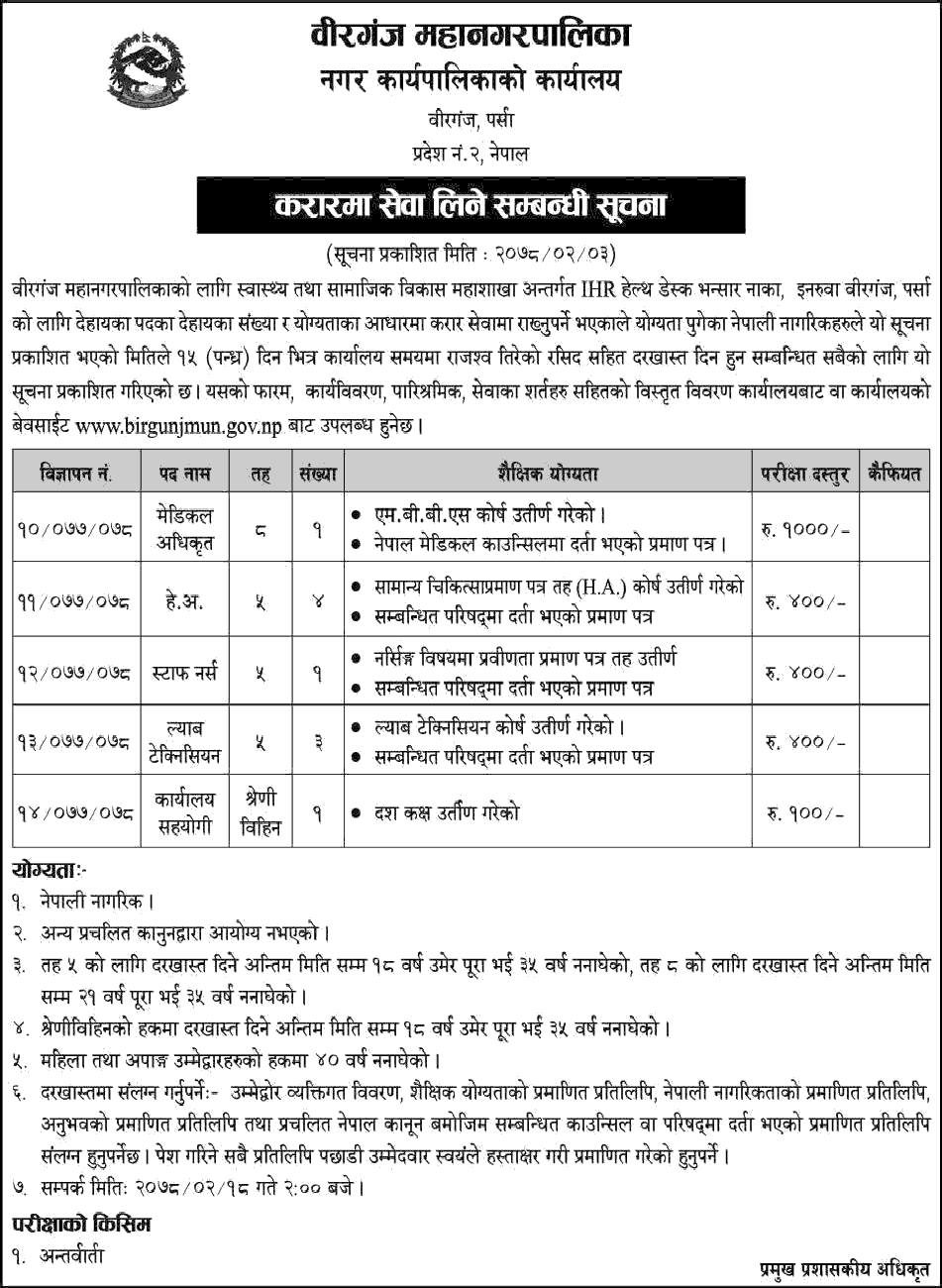 Since the following posts for IHR Health Desk Customs Naka, Inaruwa Birgunj, Parsa under Health and Social Development Division for Birgunj Metropolitan City have to be kept in contract service on the basis of the following number and qualification. This notice has been published for all those who are eligible to apply within 15 (fifteen) days from the date of publication of this information along with the receipt of payment of revenue during office hours.