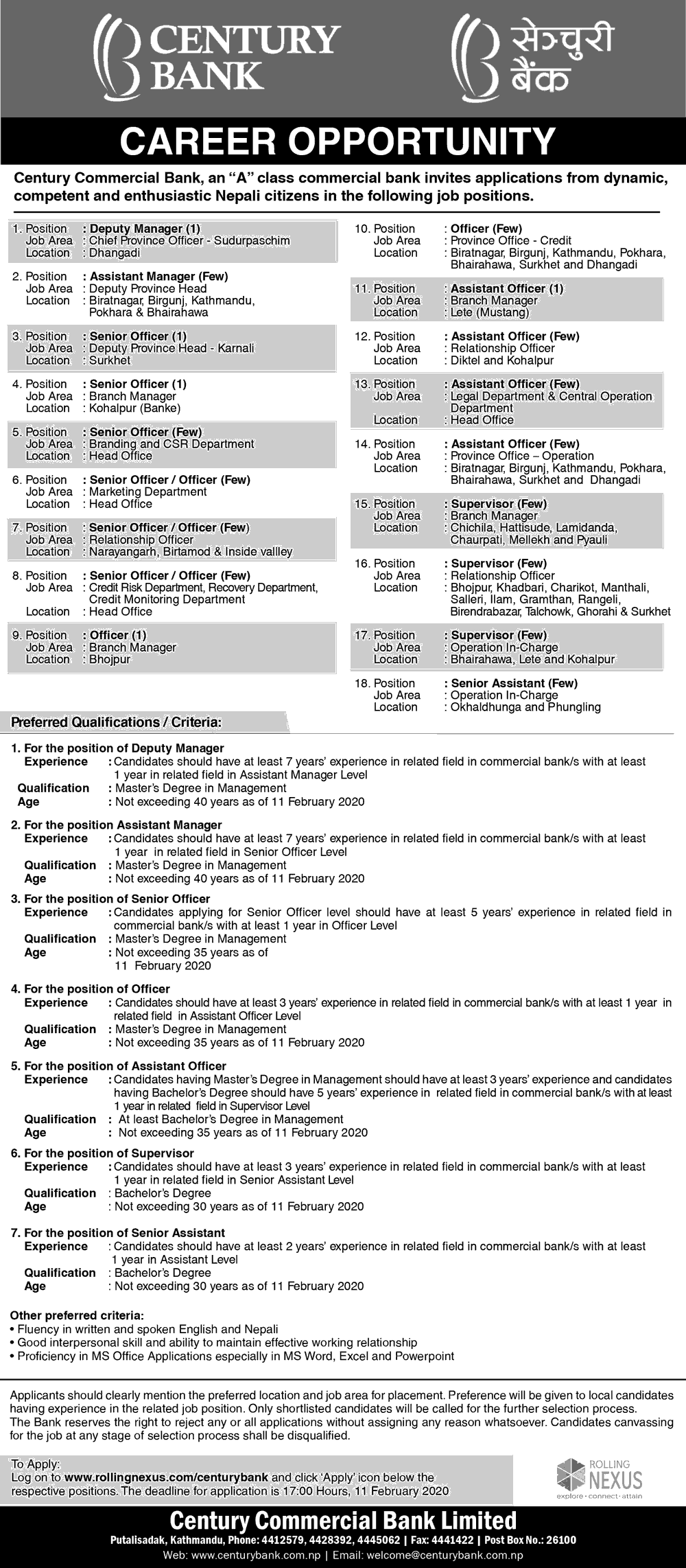 Century Commercial Bank Limited Job Vacancy for Various Positions