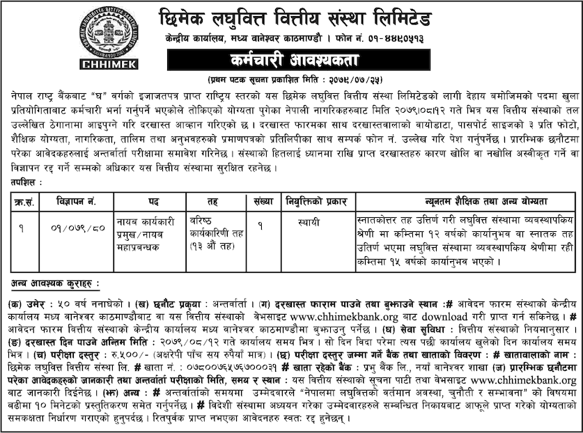 Chhimek Laghubitta Bittiya Sanstha Limited of national level licensed by Nepal Rastra Bank for the following positions through open competition; Applications are invited from Nepali citizens who have reached the specified qualifications to reach the below-mentioned address of this financial institution within the date 2079-08--12.