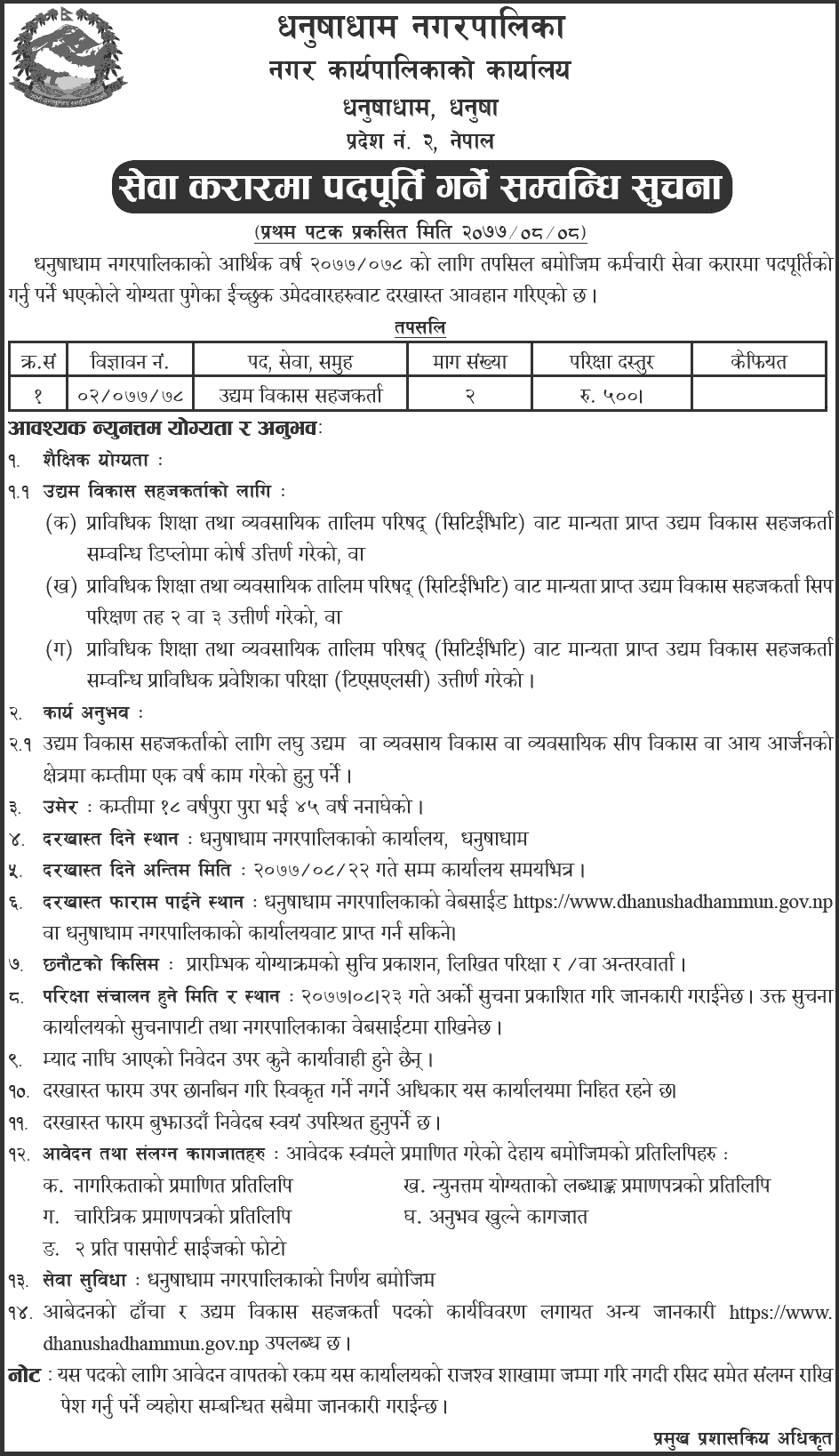 14) Application format and details of the post of Enterprise Development Facilitator are available at www.dhanushadhammun.gov.np.