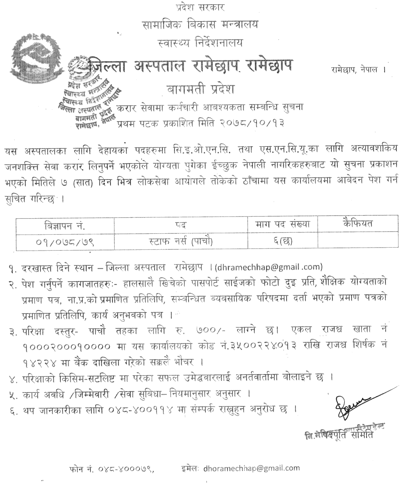 1) Place of application - District Hospital Ramechhap, Email Dhramechhap@gmail.com