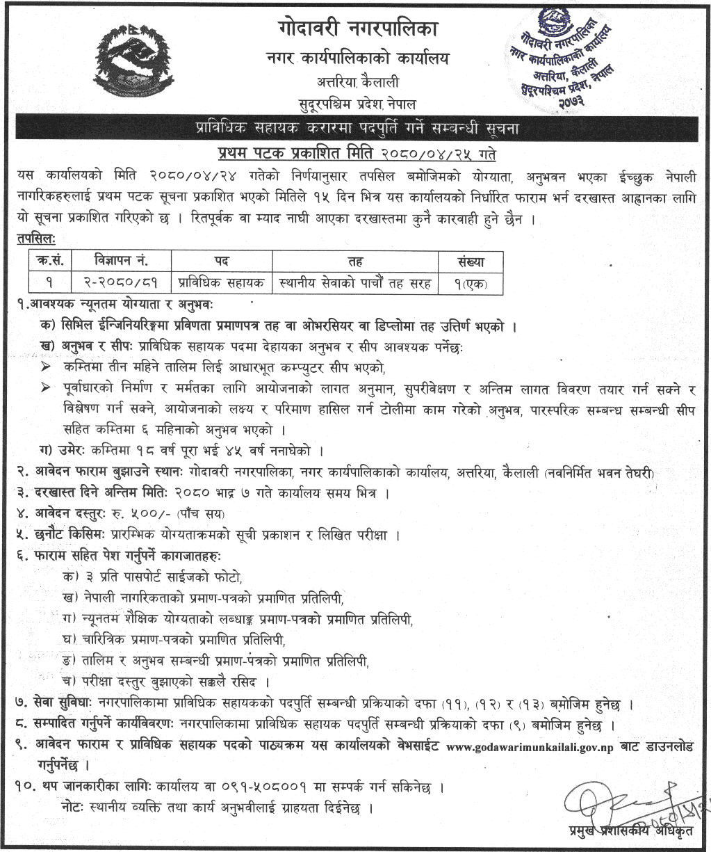 - Place of Submission: Godavari Municipality, Municipal Executive Office, Attaria, Kailali (newly constructed building Teghari)