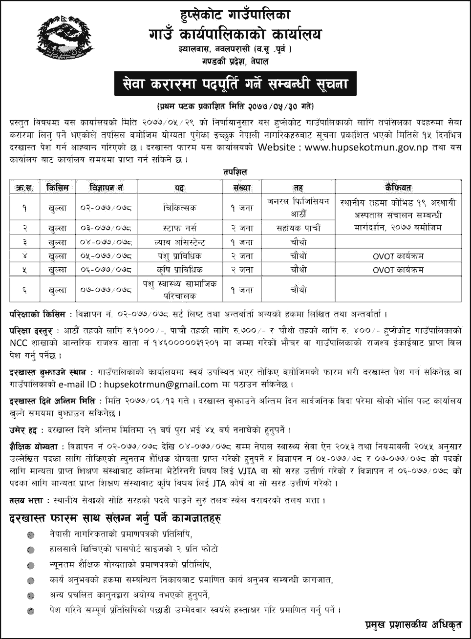Since the service contract has to be taken in the posts of the following for the Hupsekot Rural Municipality. Interested Nepali citizens who have reached the qualification as per the details are invited to submit the application within 15 days from the date of publication of the notice. Application forms can be obtained from the office at www.hupsekotmun.gov.np and from this office during office hours.
