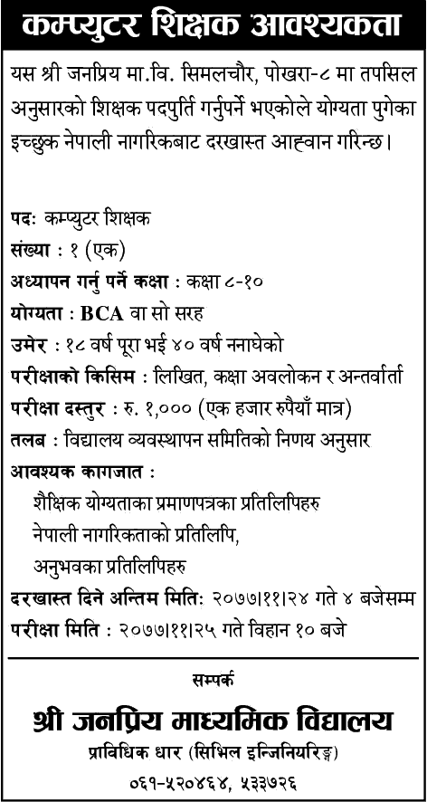 Janapriya Secondary School, Simalchaur, Pokhara-8 has to fill the vacancies as per the details; Applications are invited from interested Nepali citizens who have reached the qualification.