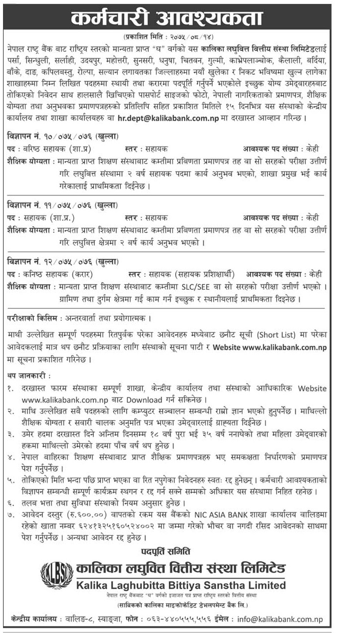 Kalika Laghubitta Bittiya Sanstha Limited published Job Vacancy Notice for various positions.