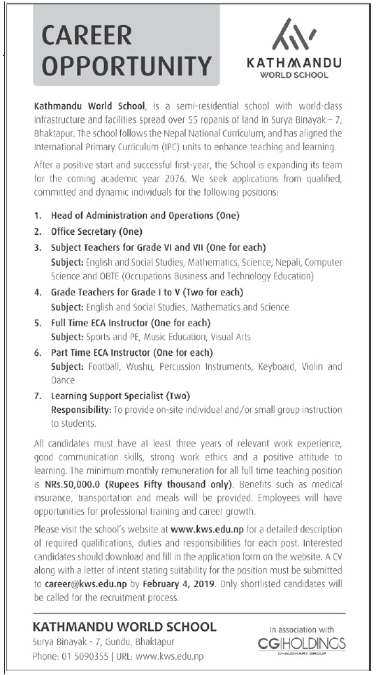 Please visit the school's website at www.kws.edu.np for a detailed description of required qualifications, duties and responsibilities for each post. Interested candidates should download and fill in the application form on the website. A CV along with a letter of intent stating suitability for the position must be submitted to career@kws.edu.np by February 4, 2019. Only shortlisted candidates will be called for the recruitment process.