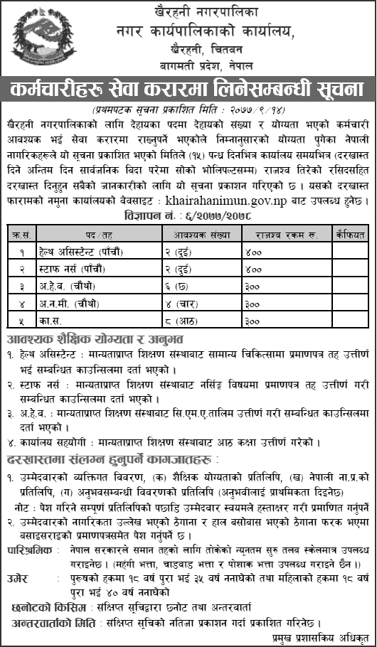 Khairahani Municipality (Nagarpalika), Municipal Executive Office, Khairhani, Chitwan, Bagmati Province, Nepal Notice regarding employees recruitment on Contract Service:
