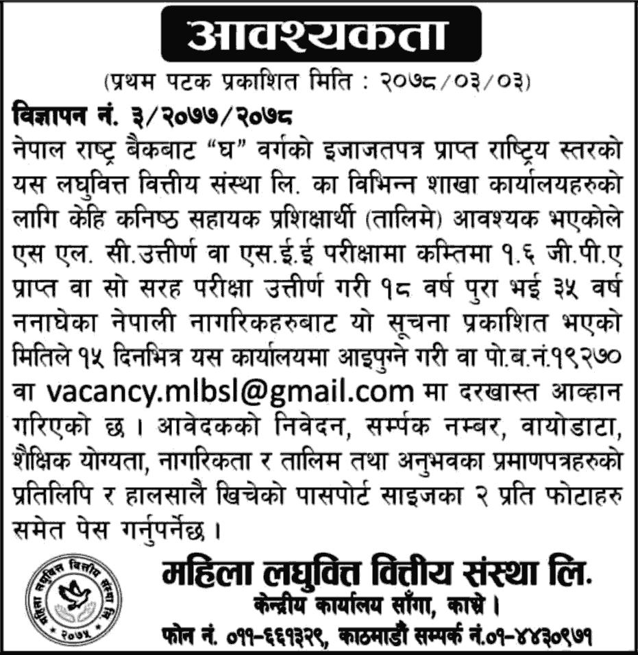 Mahila Laghubitta Bittiya Sanstha Limited (national level licensed “D” category from Nepal Rastra Bank) required few Junior Assistant Trainees for various branch offices.