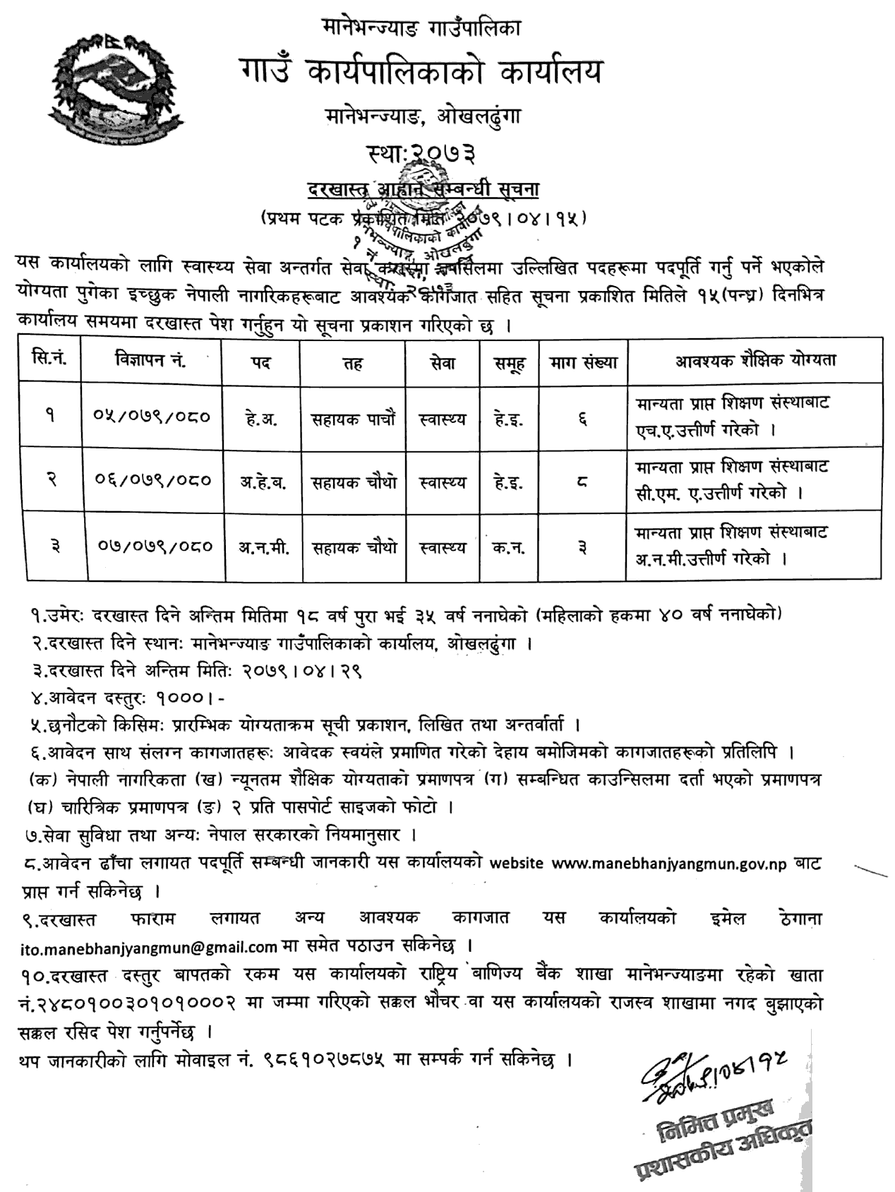 This notification has been published for Manebhanjyang Rural Municipality under Health Service, "As the posts mentioned in the oath are to be filled, interested Nepali citizens who are qualified should submit their applications with the necessary documents within 15 (fifteen) days from the date of publication of the notice during office hours.