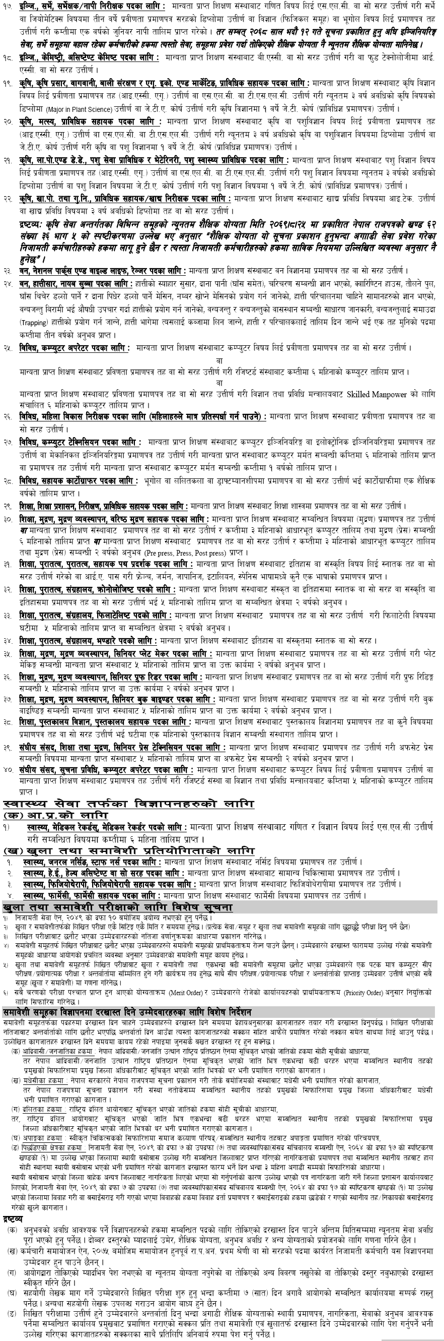 Since Non-Gazetted First Class (Technical) and Fifth Level Internal Competition of Health Service, open and inclusive posts will be filled through competitive examination. Applications are invited from the following qualified candidates. Candidates who have reached the minimum qualification will have to apply through the Commission's prescribed application system Online www.ppsconline.psc.gov.np.