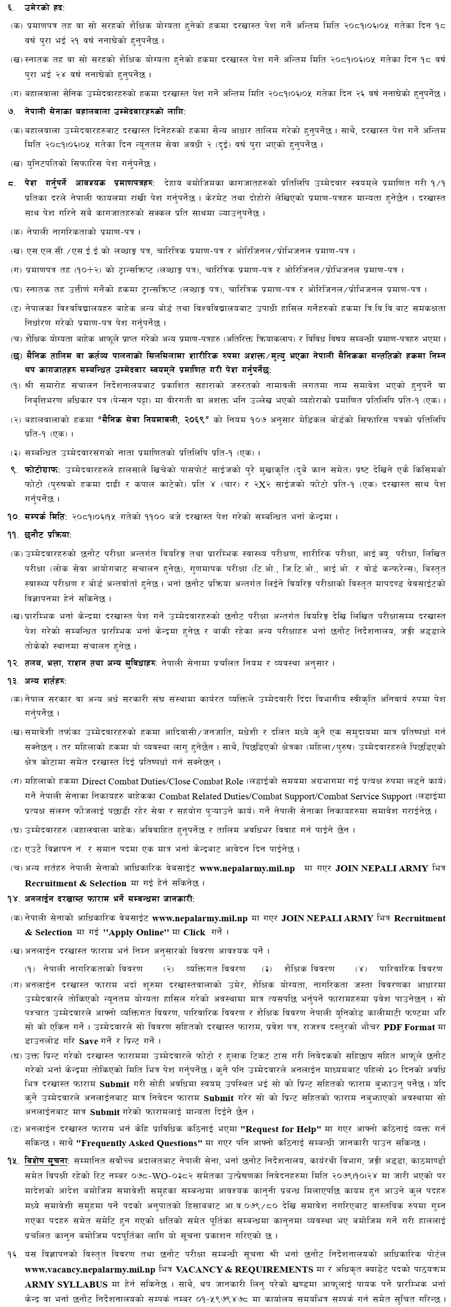 (f) Other conditions can be viewed by visiting the official website of the Nepal Army at www.nepalarmy.mil.np, under the JOIN NEPALI ARMY section within Recruitment & Selection.