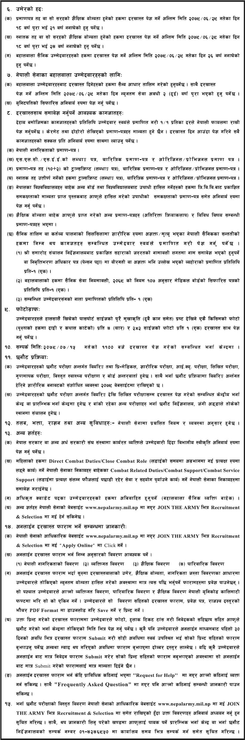 Applications have been invited to fill up the vacant post of officer (assistant soldier) in Nepali Army through open and inclusive competition. Eligible Nepali citizens are requested to fill out the online application form from the official website of the Nepal Army www.nepalarmy.mil.np along with a print-out of the same and submit the application by affixing a stamp of ten rupees to the designated recruitment center.