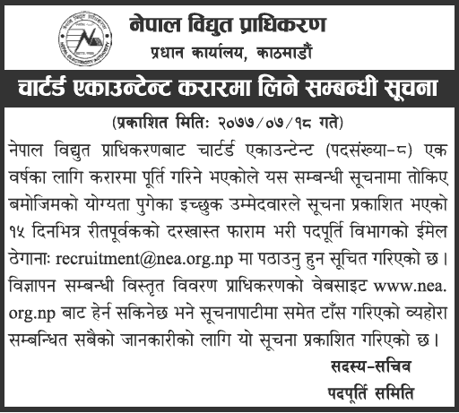 As the Chartered Accountant (CA) (Required No. 8) for Nepal Electricity Authority will be fulfilled in the contract for one year; Interested and eligible candidates are advised to fill up the formal application form and send it to the email address of the Department of Recruitment: recruitment@nea.org.np within 15 days from the date of publication of the notice.