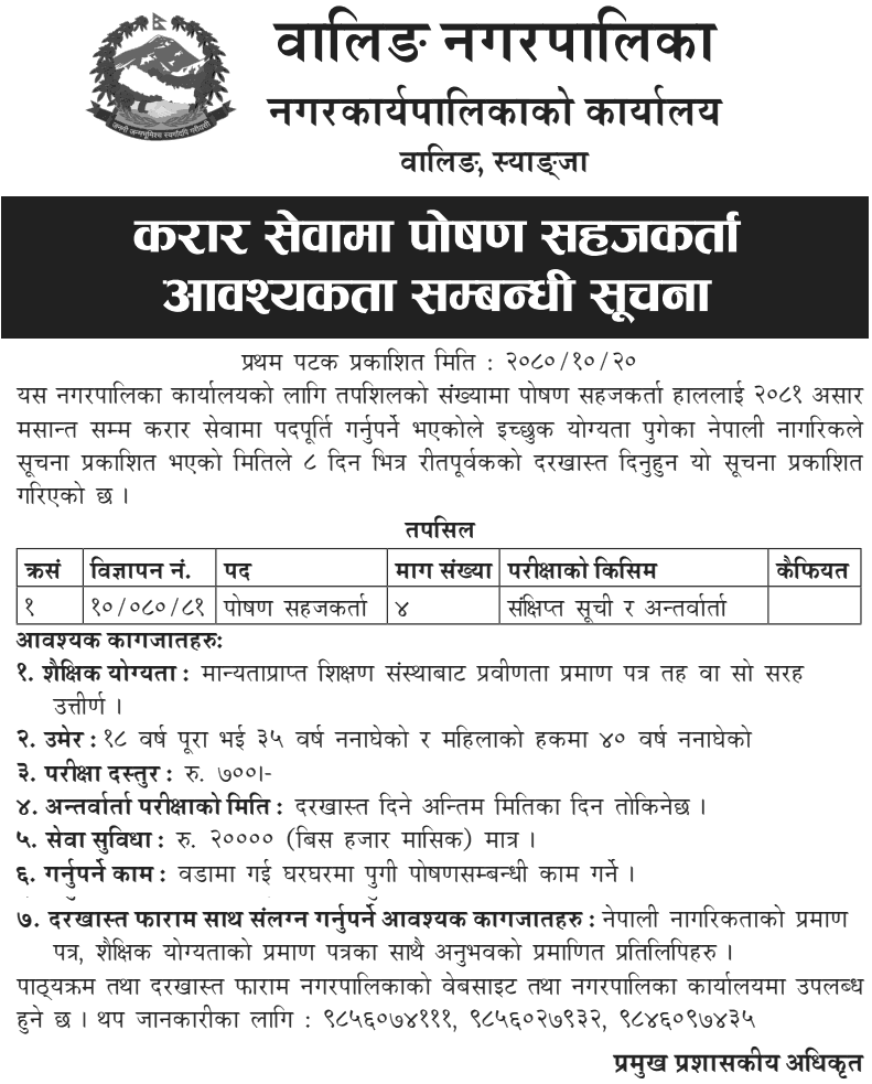Walling Municipality announces a call for applications for the role of Nutrition Facilitator. This is a fantastic opportunity for dedicated Nepali citizens to contribute to community health and wellness. We are looking to fill four positions on a contract basis by the end of Ashad 2081. Interested candidates are encouraged to apply promptly within 8 days from the notice publication date.