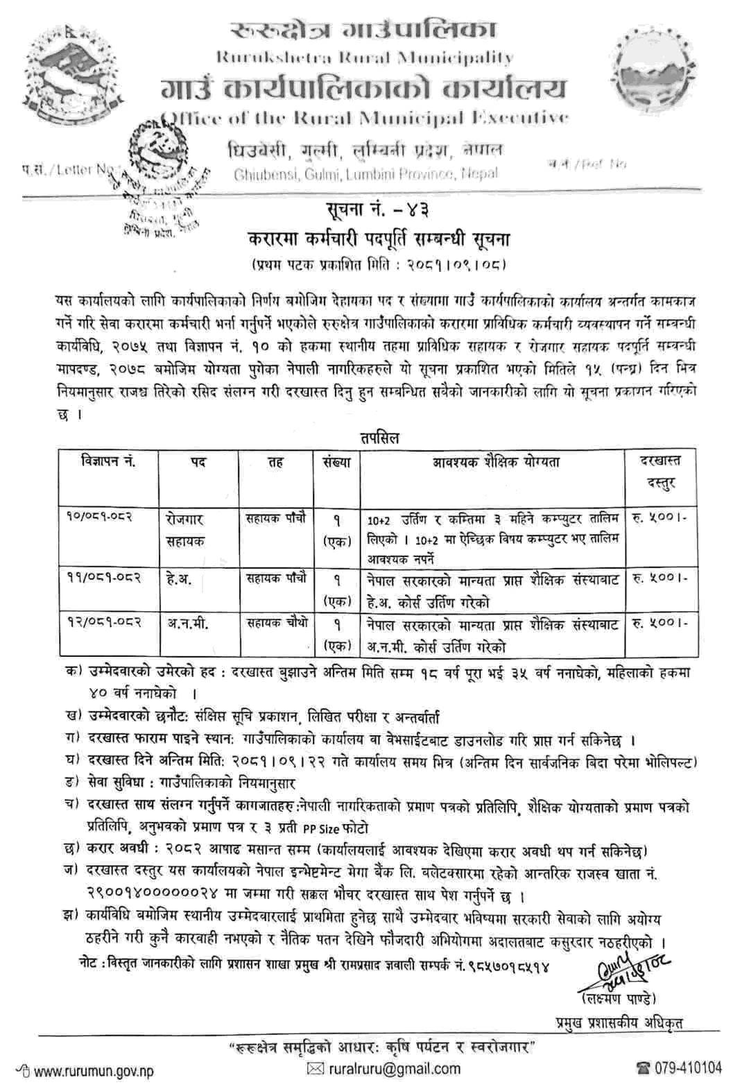 Rurukshetra Rural Municipality, Office of the Rural Municipal Executive, Ghiubensi, Gulmi, Lumbini Province, Nepal Notice Regarding Recruitment on Contract Basis