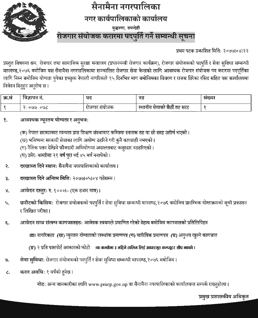 In the present case, the Ministry of Labor, Employment and Social Security (Prime Minister's Employment Program), Recruitment of Employment Coordinator and Service Facility Criteria, 2076 for the employment service center operated in this Sainamina Municipality for the required employment coordinator post on contract service. Interested Nepali citizens who have reached the following qualifications are requested to submit an application to this office within 15 days along with the required details and receipt of payment of revenue.