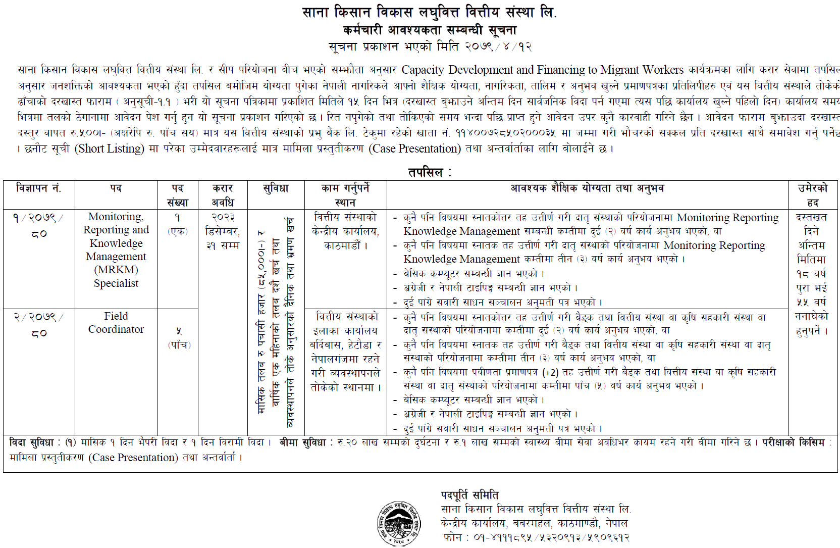 Sana Kisan Bikas Laghubitta Bittiya Sanstha Limited Notification of Staff Requirements: According to the contract between Sana Kisan Bikas Laghubitta Bittiya Sanstha Limited and the skill project, there is a need for manpower as per the contract service for the Capacity Development and Financing to Migrant Workers program; Nepali citizens who have qualified according to the list must fill in the copies of their educational qualification, citizenship, training and experience certificates and the application form prescribed by this financial institution (Schedule-1.1) within 15 days from the date of publication of this notice in the newspaper (the last day of submitting the application for public leave). This notification has been published to submit the application to the address below within office hours (on the first day of office opening thereafter). No action will be taken on applications that are not received properly and after the specified time.