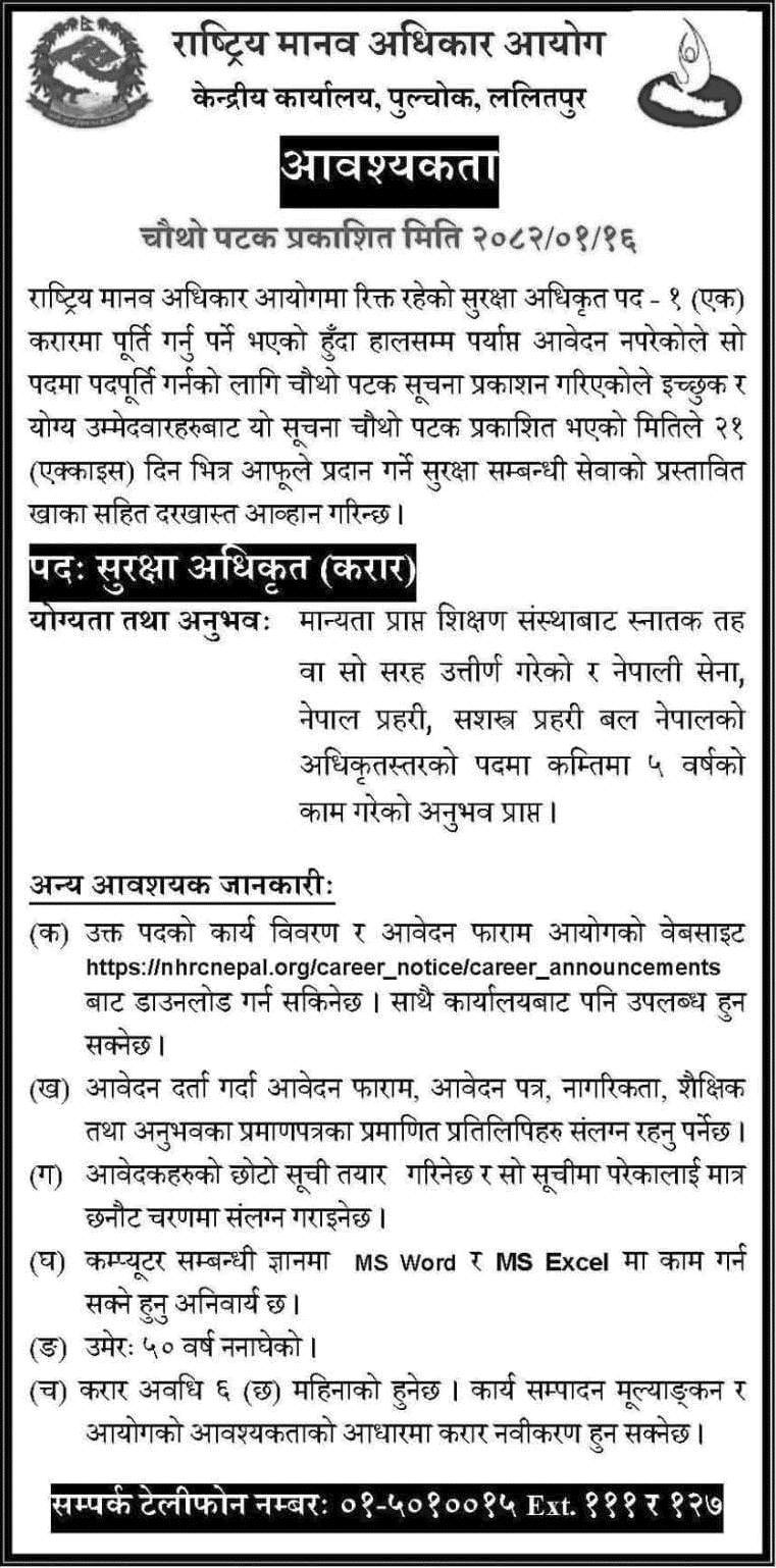 National Human Rights Commission (NHRC), Central Office, Pulchowk, Lalitpur, Fourth Notification for Contract Recruitment.