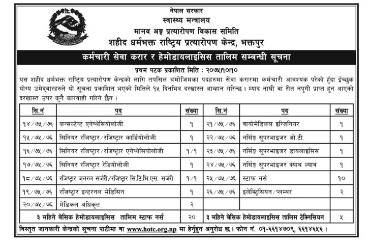 Shahid Dharma Bhakta National Transplant Center has published Vacancy notice for the various position. The hospital is seeking applicants from the interested candidates in the contract basis in various positions.