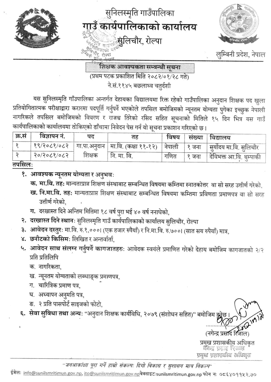 Applications are invited from eligible Nepali citizens to fill vacant grant-funded teacher positions at the schools under Sunilsmriti Rural Municipality through an open competitive examination on a contract basis. Interested candidates who meet the minimum qualifications listed below must submit their application along with the revenue payment receipt to the Rural Municipality Office within 15 days from the date of this notice.