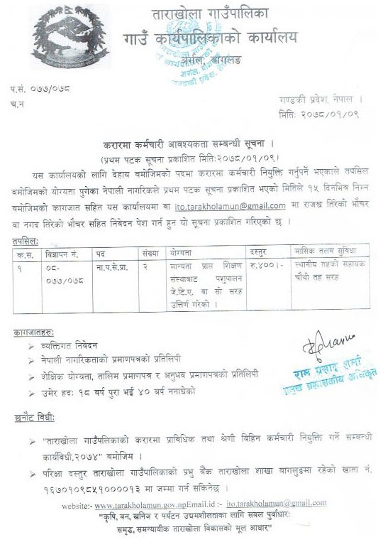 Tarakhola Rural Municipality (Gaupalika), Argal, Baglung, Gandaki Pradesh, Nepal invites job application for the position of VJTA (4th Level Animal Services) on contract services. Interested and eligible Nepali citizens may apply within 15 days (till 2078 Baishakh 23) along with supportive documents.