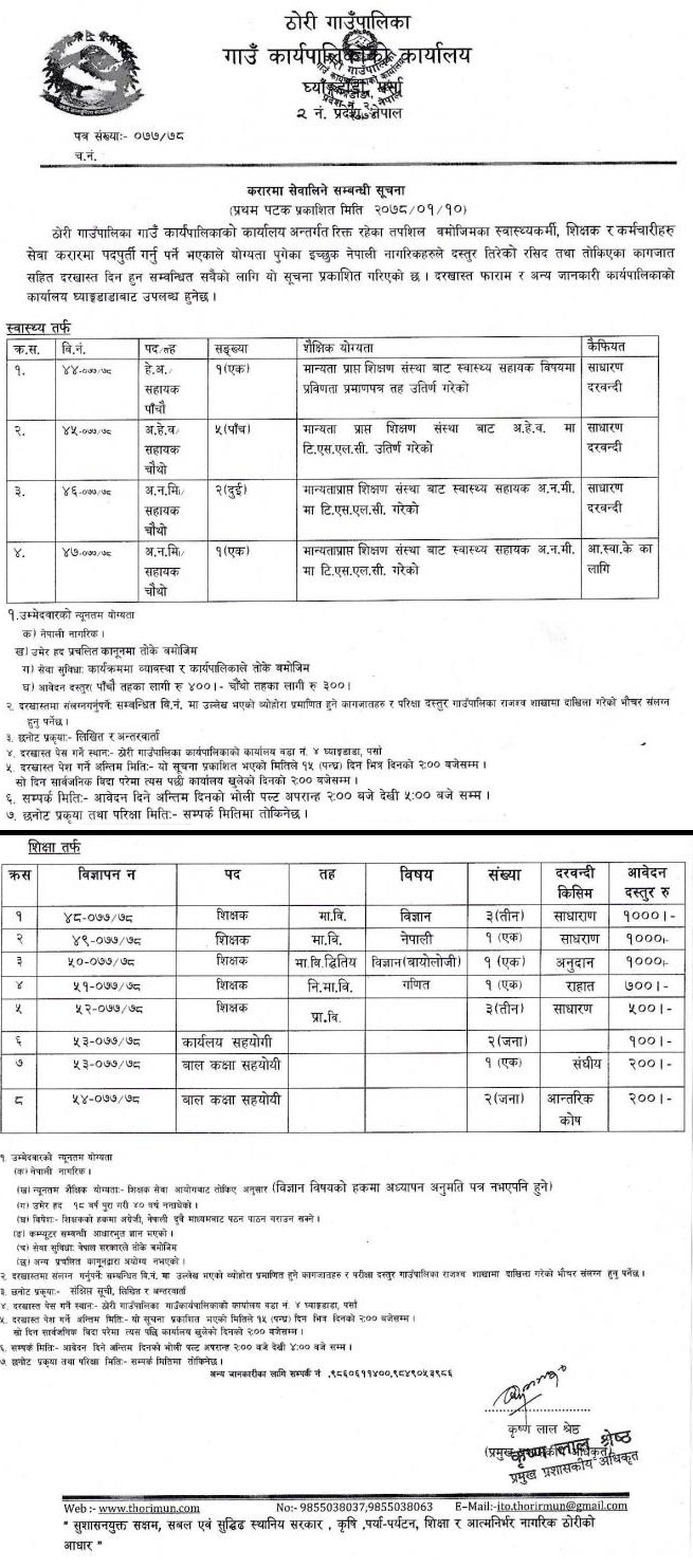 Under the office of the Thori Rural Municipality, Rural Municipal Executive Office, Ghyangdanda, Prasa, Province No. 2 announces vacancies for health workers, teachers and staff have to be posted in the service contract. This notice has been published for all concerned to apply along with the receipt of the fee paid by the eligible Nepali citizens and the prescribed documents. Application forms and other information will be available from the Executive Office, Ghyangdanda.