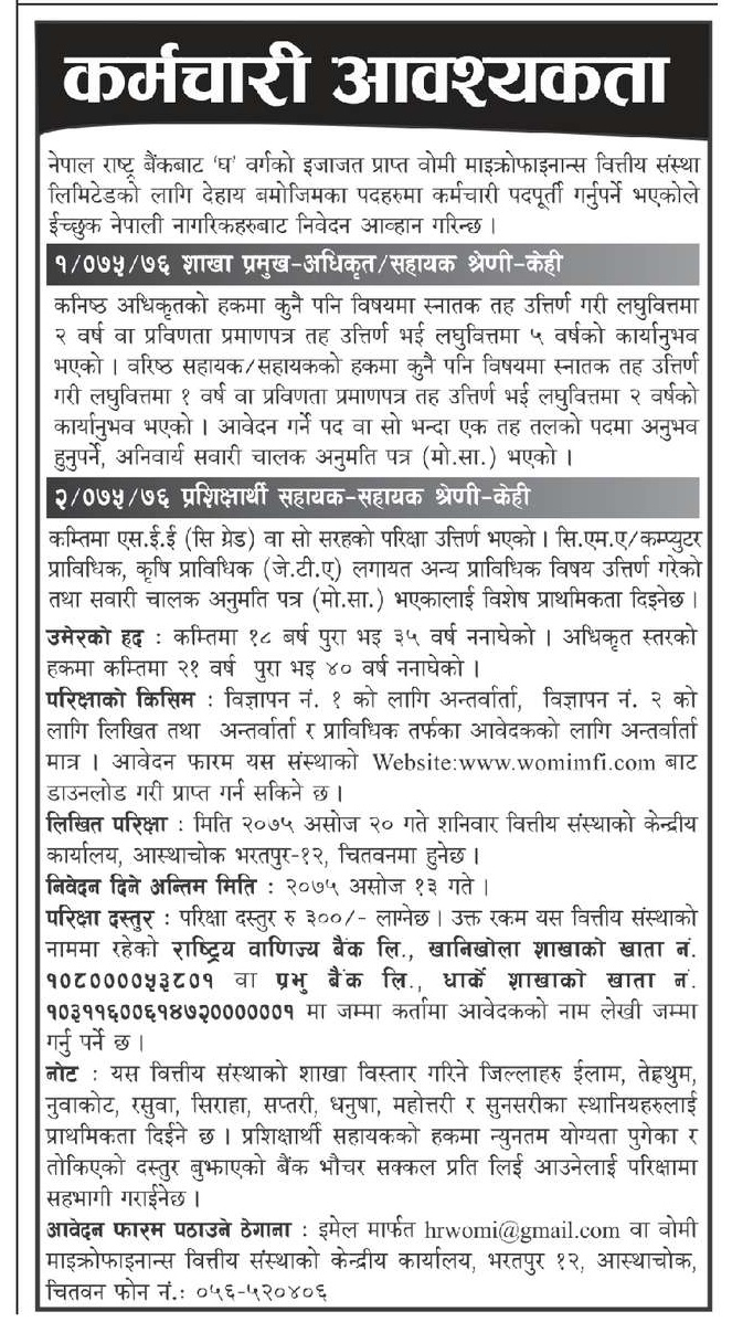Womi Microfinance Bittiya Sanstha Limited announces Job Vacancies